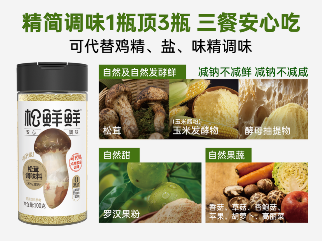 针对国人钠摄入超标的问题,市面上有产品通过0添加的解决方案减少钠含量,但这类产品往往“不好吃”,与消费者购买调味品的核心需求背道而驰。为给到一种既好吃又健康的解决方案,松鲜鲜创始人易子涵及其研发团队尝遍全球菌菇,独创“松茸+玉米酱粉+酵母抽提物+罗汉果粉”配方,实现了减钠不减咸、减钠不减鲜的效果,精准击中国人既要好吃又要健康的需求痛点。