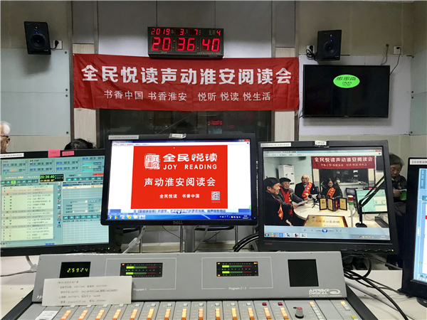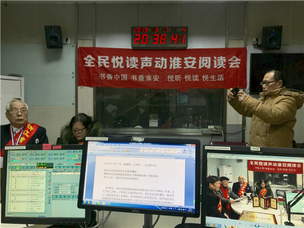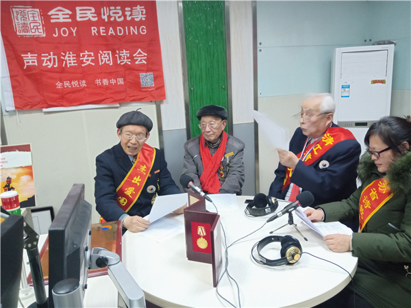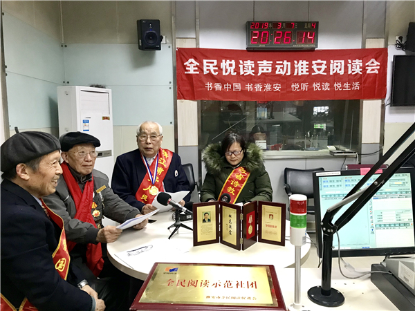 新华访谈网淮安讯 3月7日晩上8:30,淮安秋月正红读书会吴玉山会长带领杨义春、郝宇铭、王步琴等三名高级顾问,来到淮安电台经济生活广播直播室,参加了一场“盛赞彩叔讲古诗”专题访谈节目。