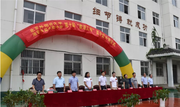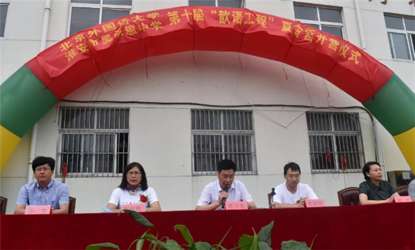 7月9日上午7:30在雄壮的国歌声中,北京外国语大学·淮安市吴承恩中学第十届“歆语工程”夏令营开营。开营仪式在吴承恩中学内操场举行,近千名吴中师生参加开营仪式,北京外国语大学领队老师尤晓杰、周世梅,淮安区委教育工委书记、区教体局局长房乃发,区教体局党委委员张红,区教体局党委委员、工会主席孙青应邀出席仪式。开营仪式由吴承恩中学副校长刘仕军主持。