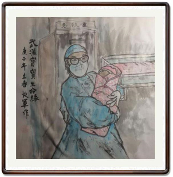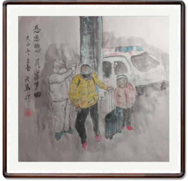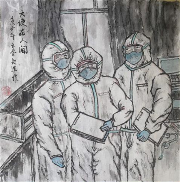 他先后创作了《天使在人间》《疫情吹哨人》《生命缘》《感恩的心》等近十幅国画作品。