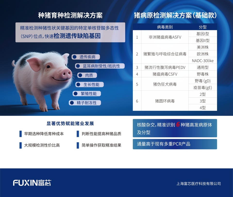 种猪育种方面,富芯医疗联合华中农业大学专家,开发出覆盖遗传疾病、蓝耳病耐受性/抵抗性、肉质、生长性能、繁殖性能及精子耐冻性六大维度的育种检测方案,可快速识别遗传缺陷基因。结合智能生物芯片检测一体机,该方案可同时检测24个样品,全程不超过两小时。全国产化的技术体系也显著降低了检测成本,助力优质种猪“赢在起跑线”。