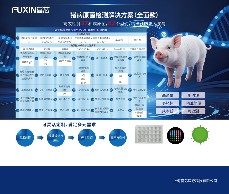在猪病原菌检测方面,富芯医疗推出基础款与全面款两款芯片,以满足客户不同应用场景的需求。基础款可对6种常见病原检测及分型(非洲猪瘟、蓝耳、伪狂、圆环、猪瘟、流行性腹泻),适合猪场日常监测;全面款则集成37种猪常见病原的检测及分型需求,适用于猪场及实验室的全面筛查。此外,富芯还支持根据客户需求提供定制化服务。